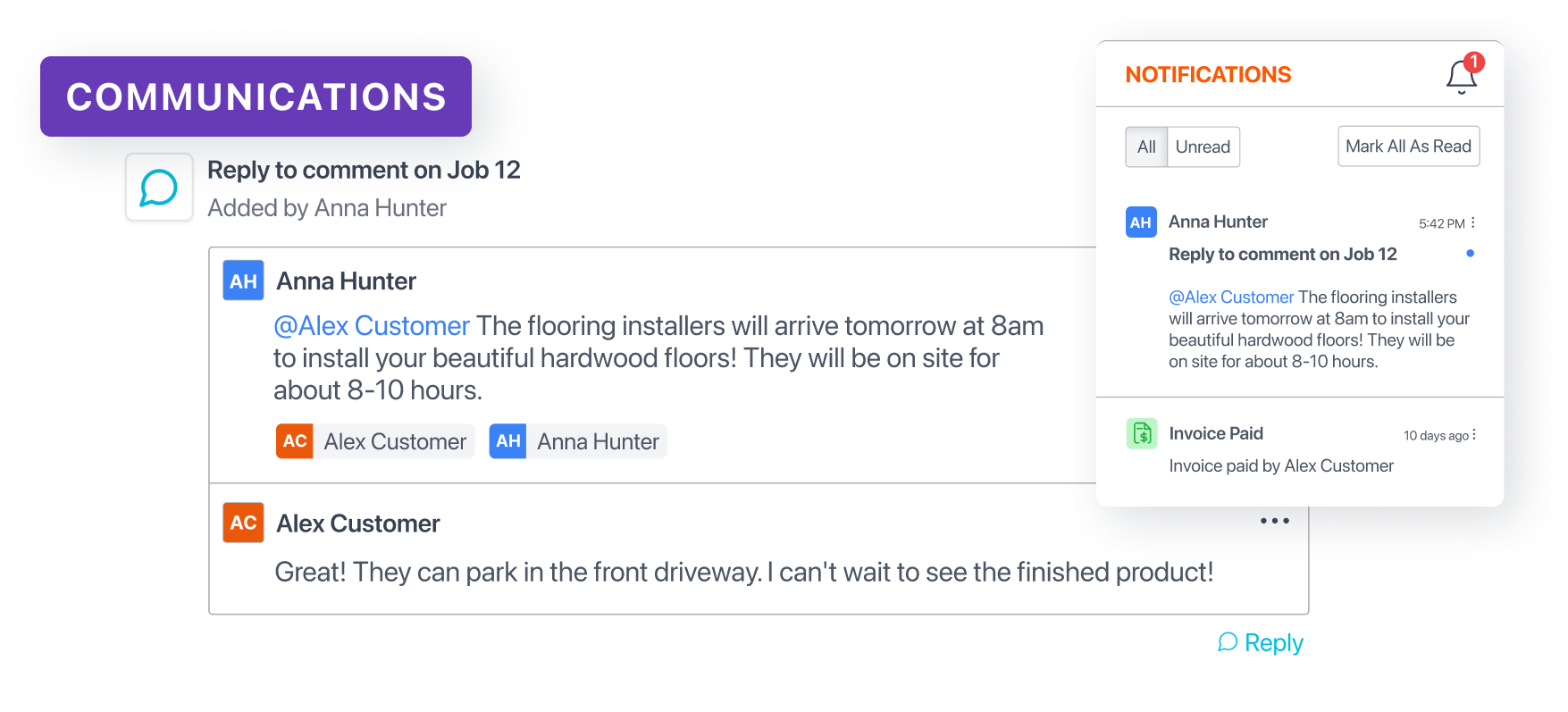 Easily monitor the project as new updates happen, without needing to be on-site and keep everyone on the same page while eliminating the need for multiple communication channels.